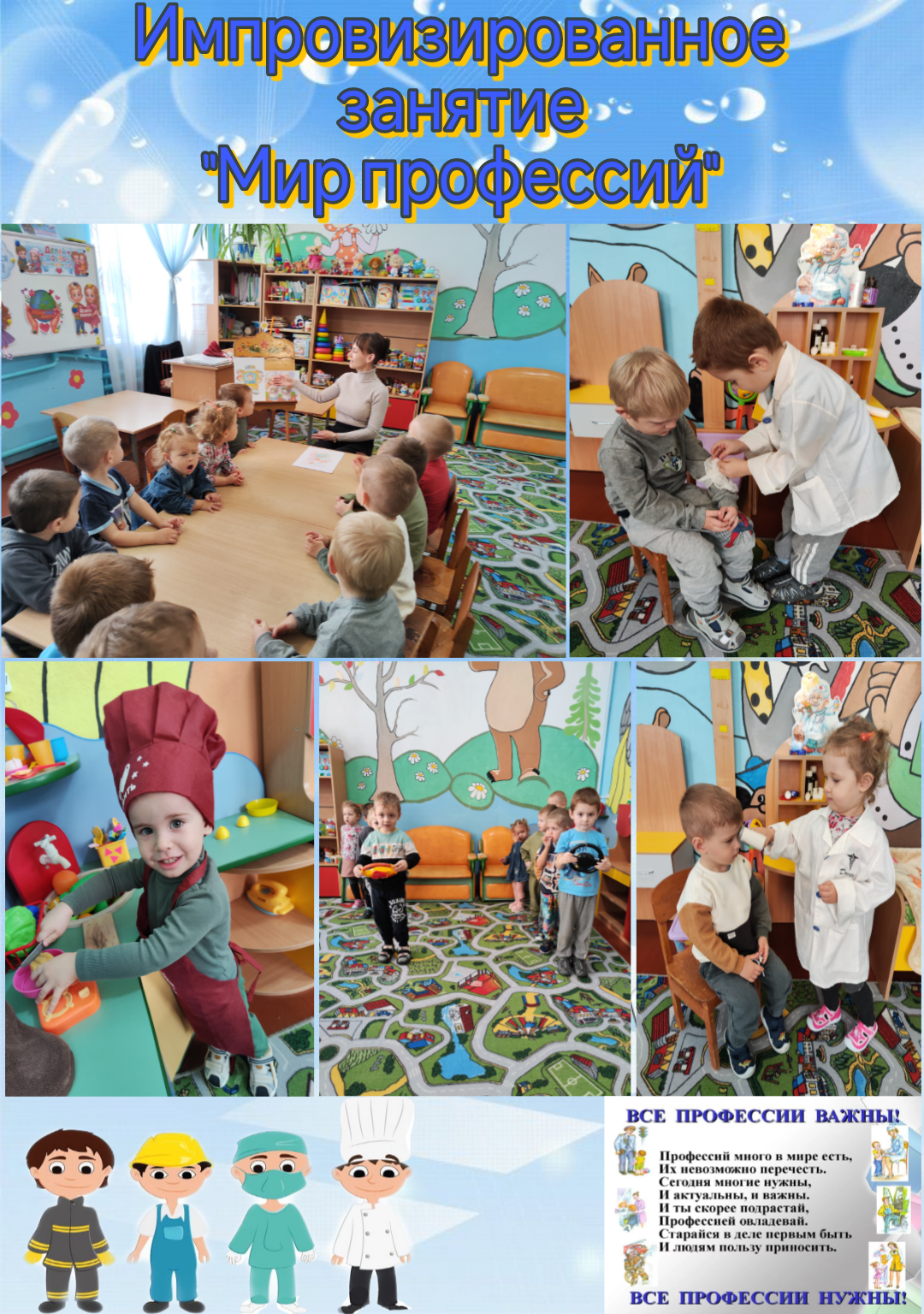 Сегодня в младшей группе прошло занятие на тему "Мир профессий". Целью, которого является расширять знания детей о профессиях взрослых. Понимать значимость профессии в жизни людей.Воспитывать уважение к результатам труда людей разных профессий.