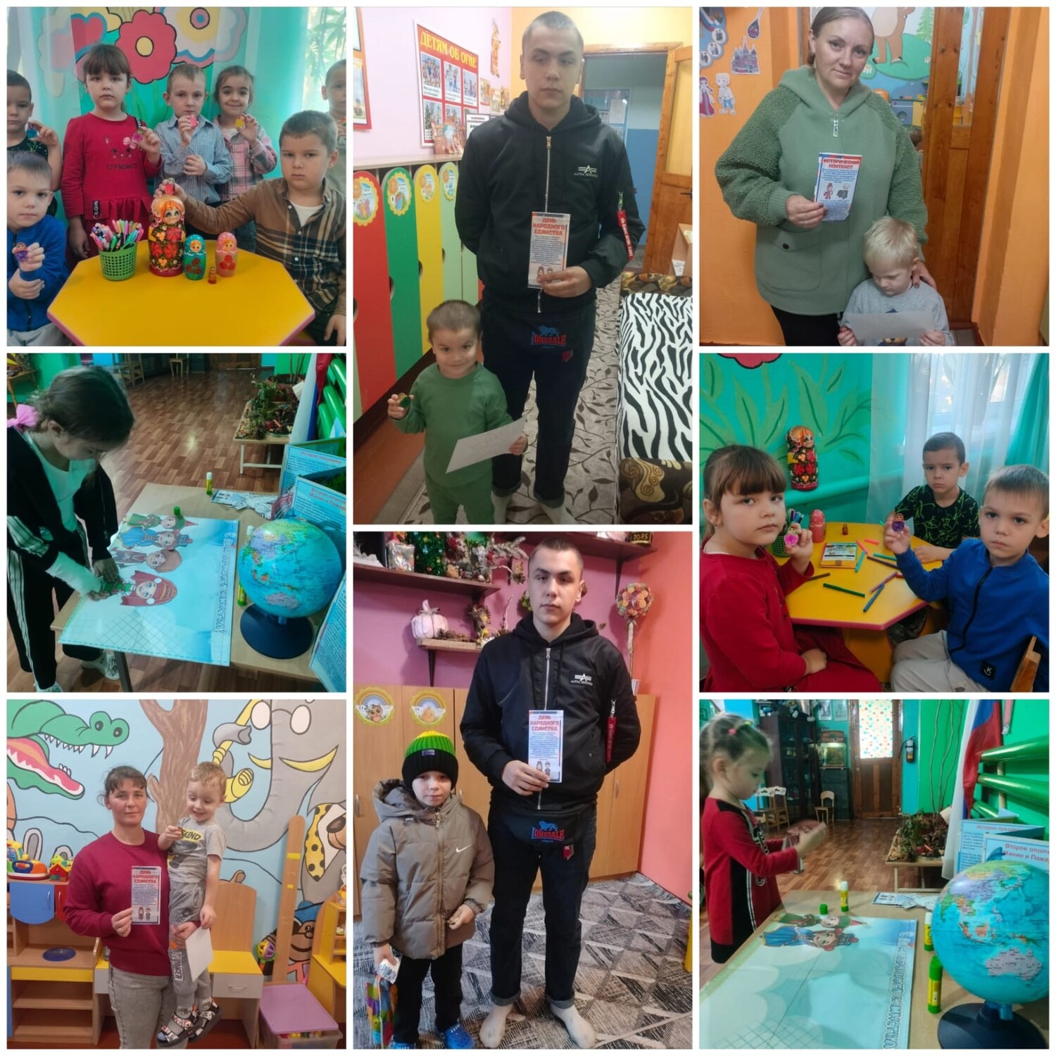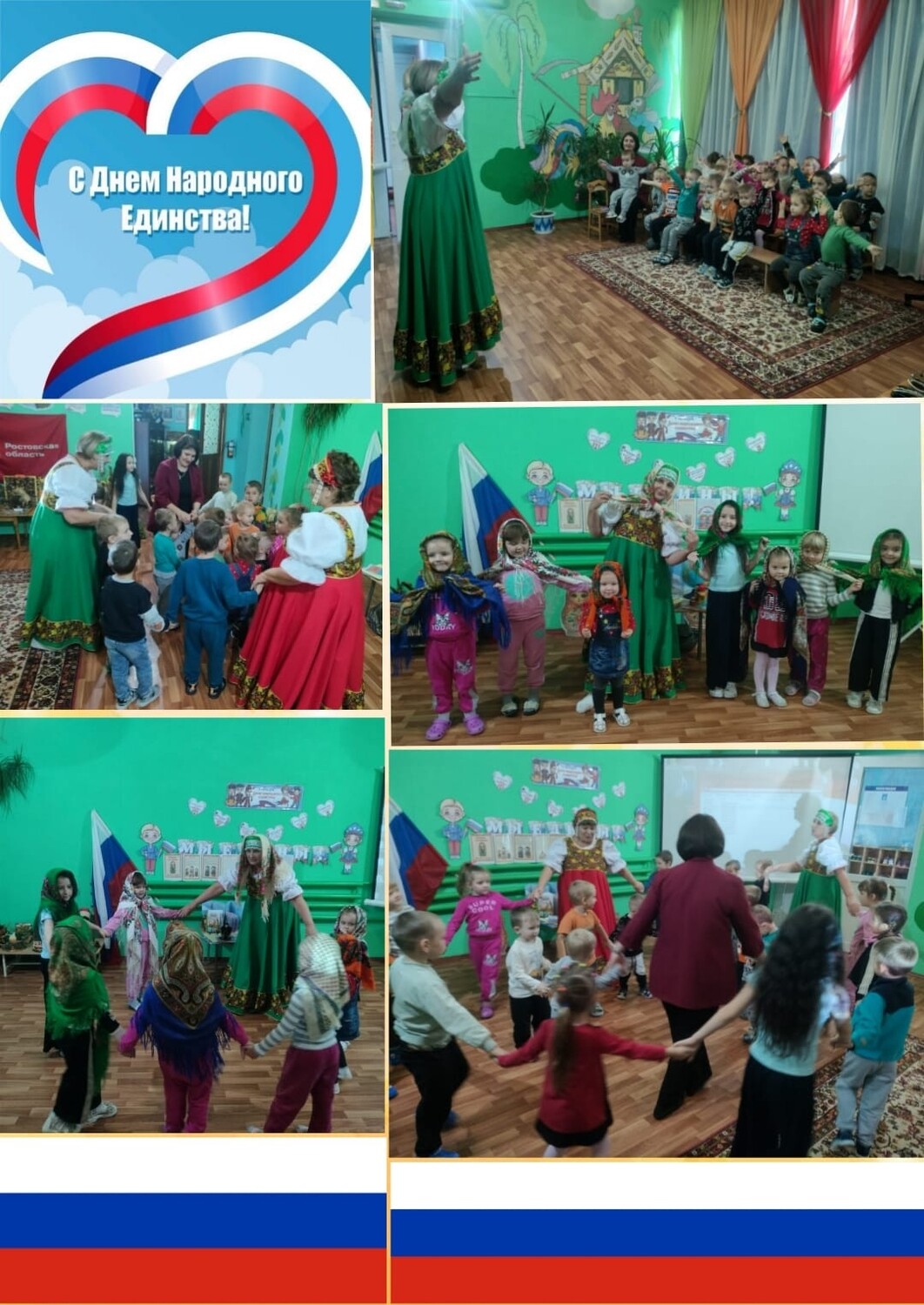Наш детский сад с интересным и познавательным мероприятием посетили работники Весело-Вознесенской библиотеки Самохвалова Н. И. и Волкова Л.И. Воспитанники посмотрели презентацию о истории праздника, познакомились с народами, населяющими нашу страну, национальными костюмами, обычаями, играми. Дети играли в национальные игры, исполняли танцы народов, населяющих нашу великую страну. Мы верим, что именно в детстве закладываются основы для мирного и гармоничного будущего. И День народного единства – это прекрасная возможность напомнить об этом нашим детям и показать им, что вместе мы – большая и дружная семья!