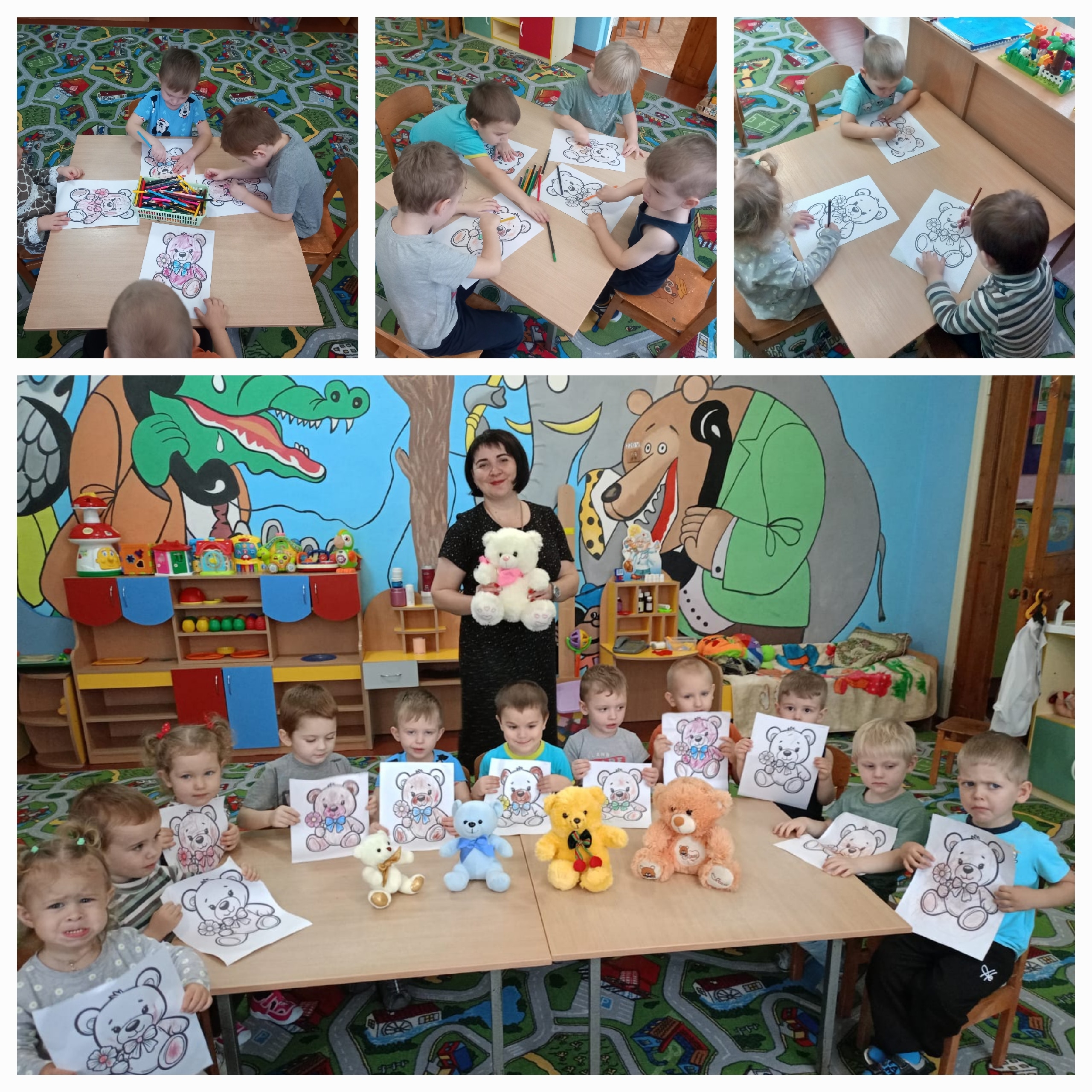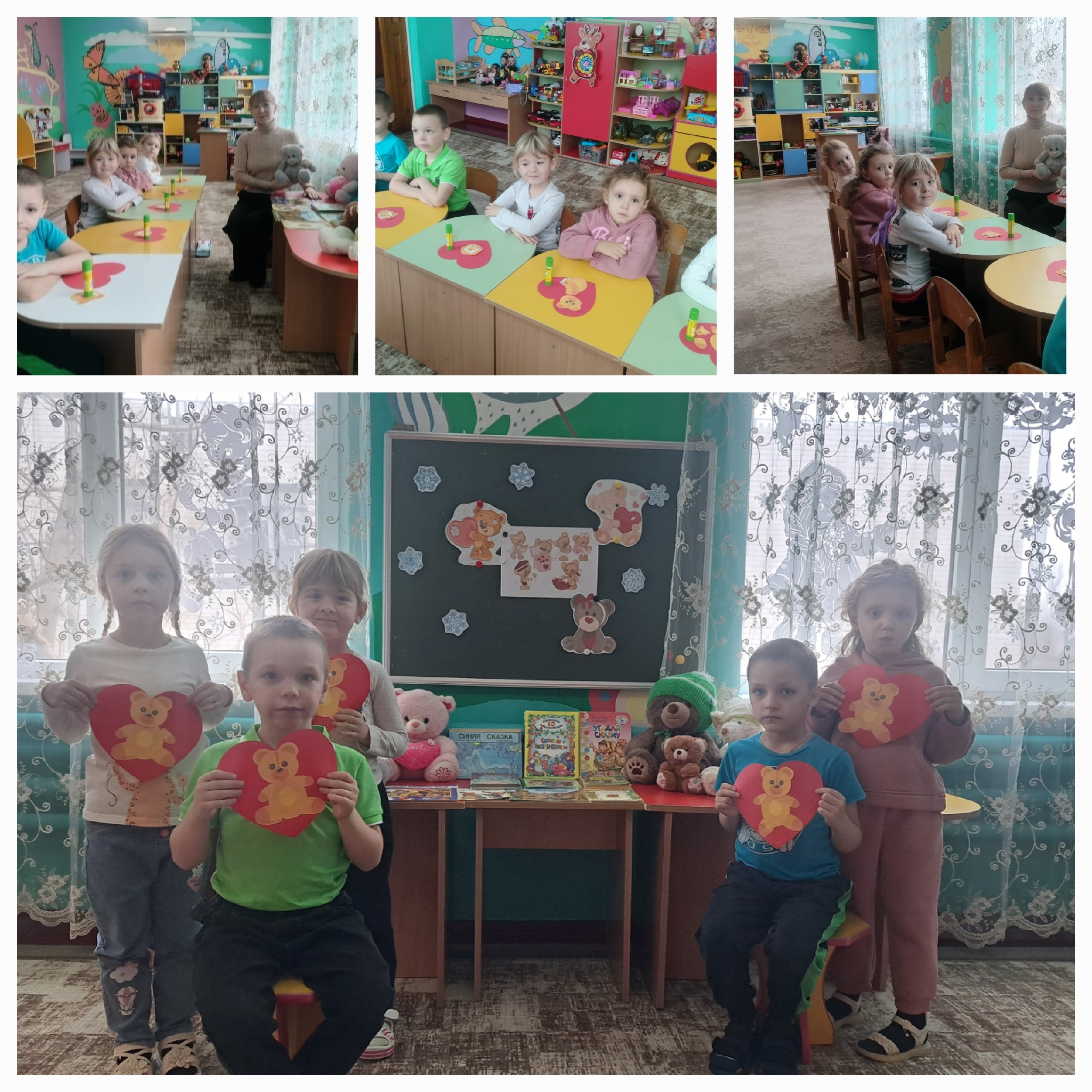 В течении дня детям читали сказки и стихи о мишке, рассматривали иллюстрации, рисовали мишек, мастерили аппликацию "Мишка - Топтыжка",. Вместе с воспитанниками была оформлена выставка "Друг детства- Медвежонок. Выставка плюшевых мишек и медвежьих книжек".