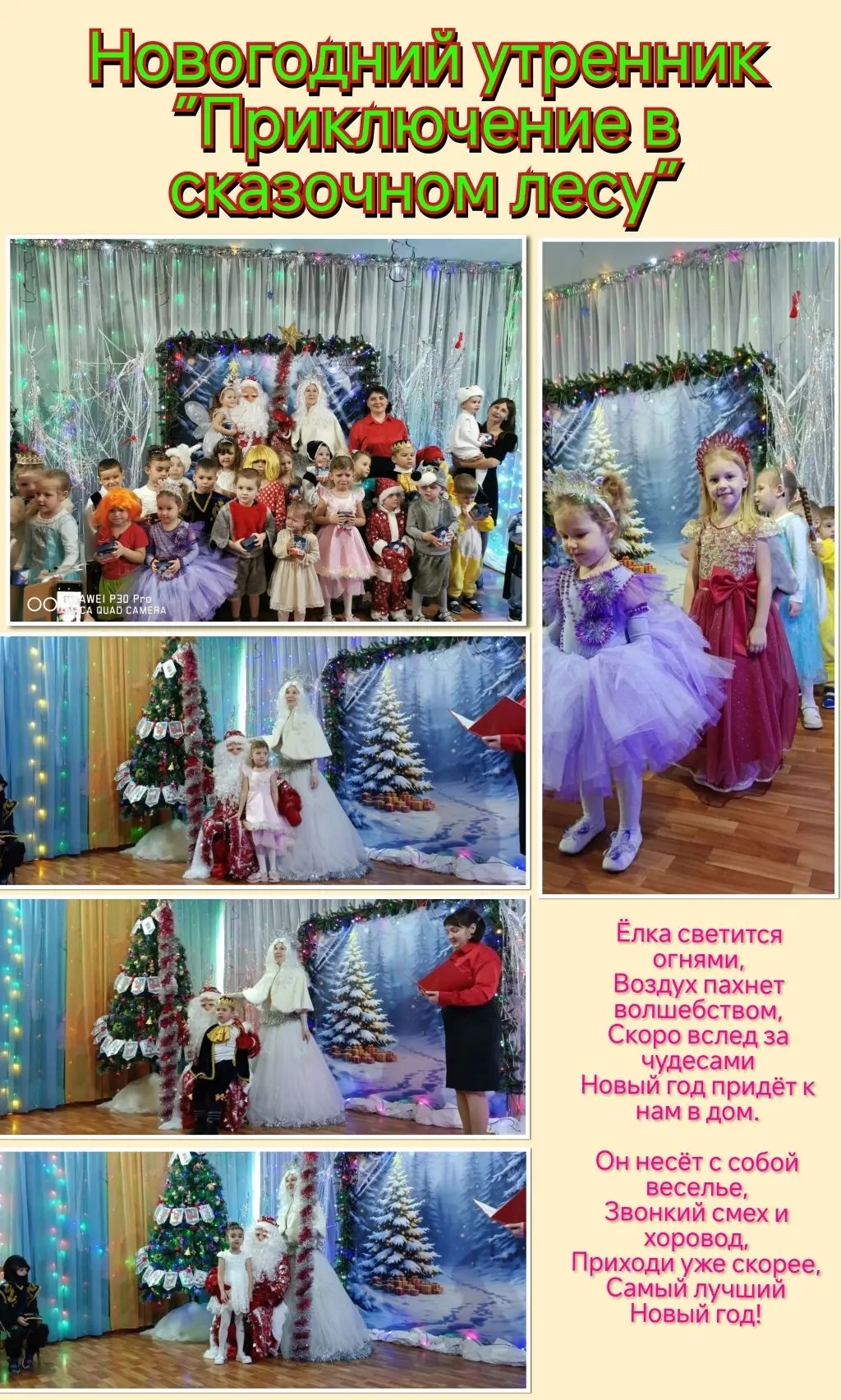 В нашем детском саду прошёл новогодний утренник "Приключение в сказочном лесу". Ребята отправились на поиски Деда Мороза и Снегурочки в сказочный лес. На своём пути дети встретили Лису Патрекеевну, Снеговика и Медведя Топтыгина. Каждый персонаж предлагал ребятам игры, танцы, забавы, что очень повеселило юных путешественников. Ребята пели песни, водили хороводы, читали стихи. В завершение путешествия произошла долгожданная встреча с самым добрым волшебником Дедушкой Морозом и его внучкой Снегурочкой. Дети спели песню Деду Морозу, поиграли с ним в игру "Заморожу", расскази стихи. Дедушка Мороз вручил всем ребятам подарочки. Этот праздник подарил много приятных, радостных моментов и надолго запомнится и детям , и взрослым.