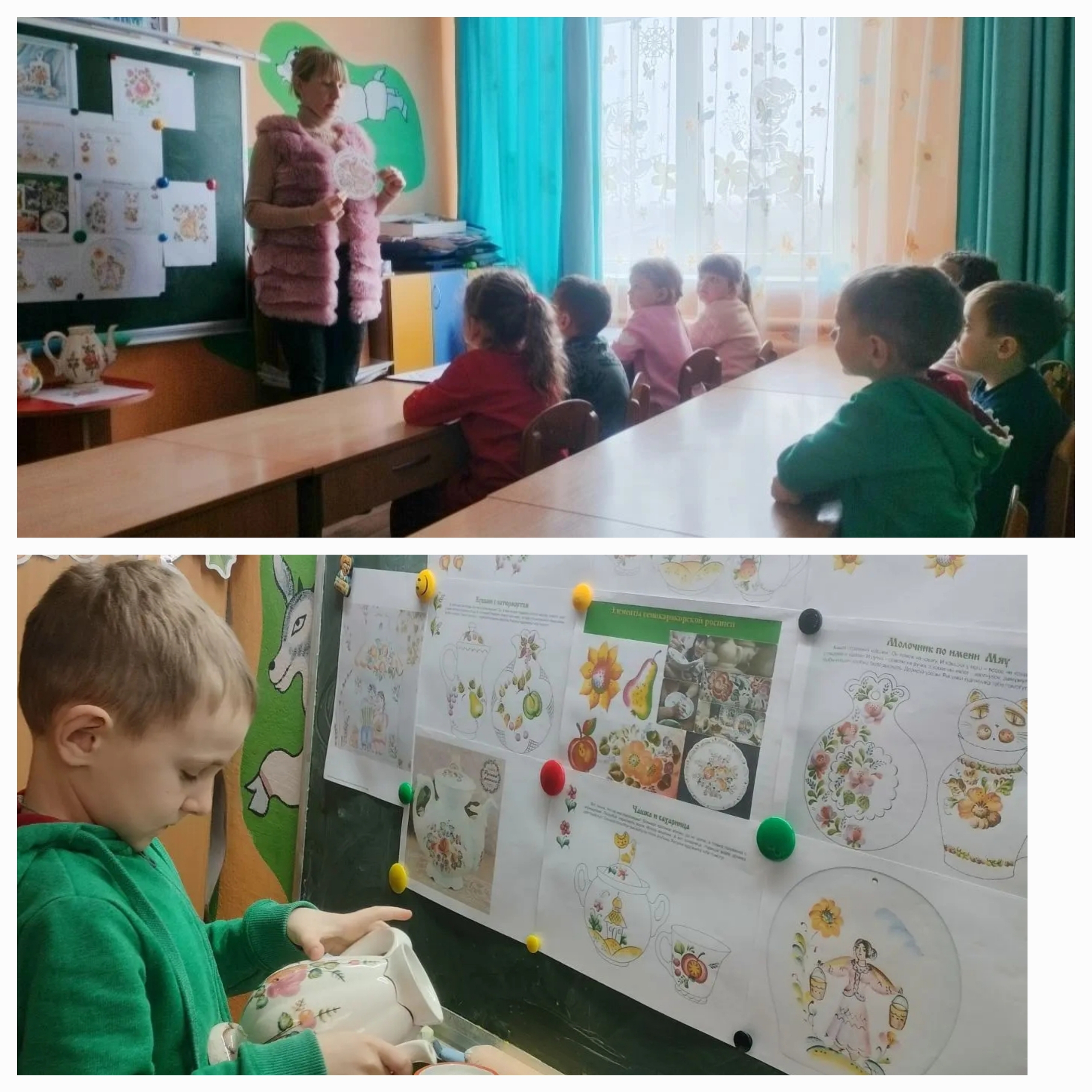 В целях приобщения воспитанников к ценностям "Культура" и "Красота", ознакомления с декоративно-прикладным творчеством населения Ростовской области в различных видах творческой деятельности (рисованию, лепке), с народными игрушками, с посудой и утварью в старшей группе было проведено тематическое мероприятие по созданию аппликации "Семикаракорская роспись в предметах посуды".
